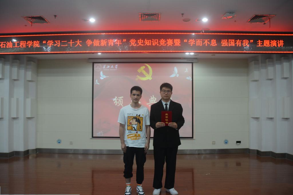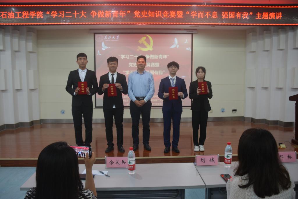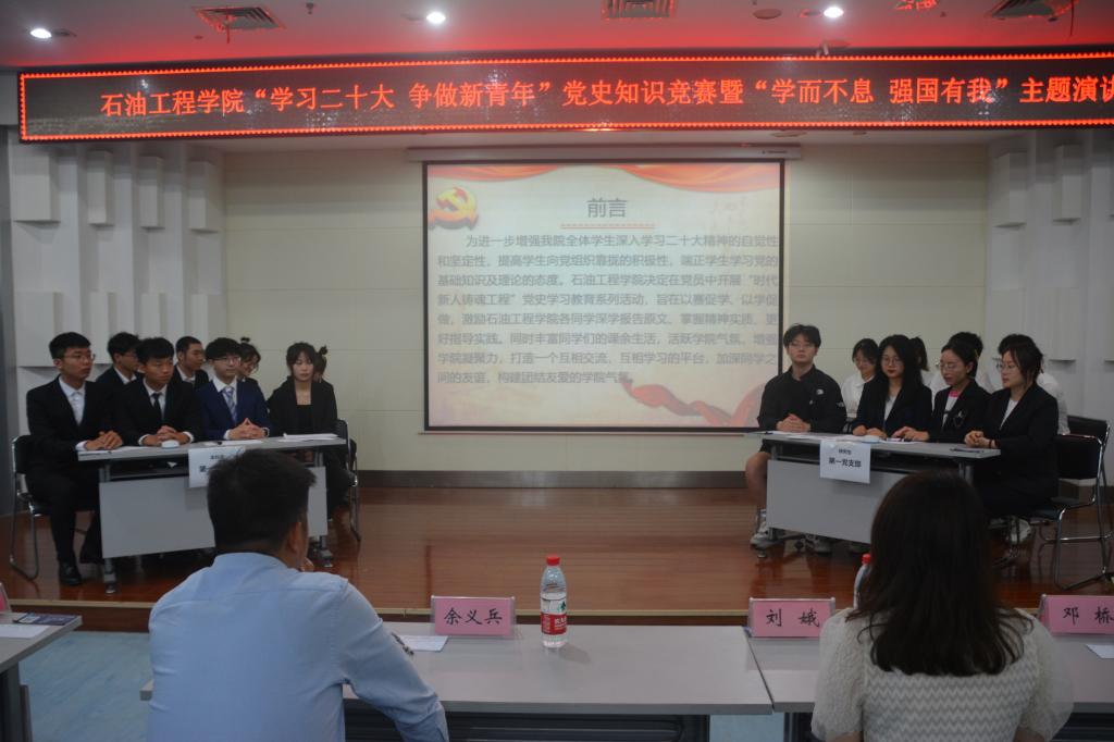 (通讯员 王雪瑶/文 刘科技 刘昕竹/文)2023年04月20日18:00,44118太阳成城集团于图书馆报告厅顺利开展“学习二十大 争做新青年”党史知识竞赛暨“学而不息 强国有我”主题演讲活动。公司党委副书记刘娥、油气井工程系教工党支部邓桥、余义兵,学工办史永波、郭冀宁、周晓峰、陈金建老师莅临本次比赛现场。