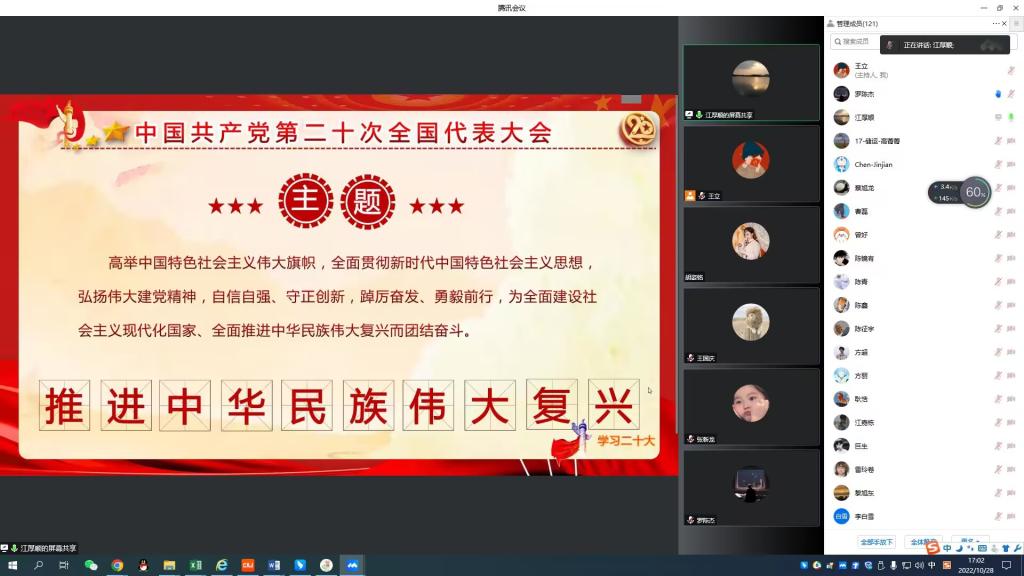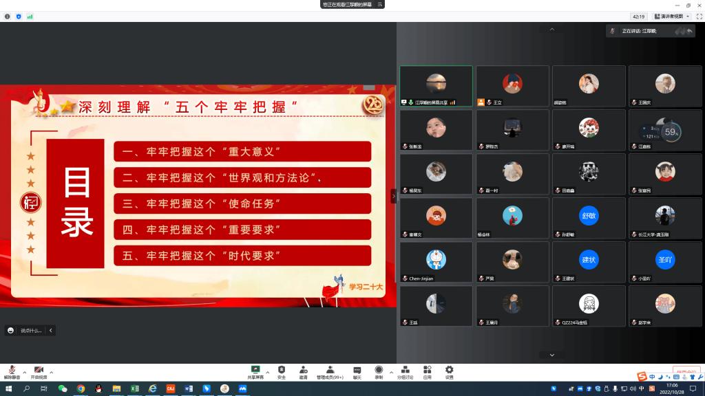 (通讯员 盛钲钦)10月28日下午4时,公司经理江厚顺在腾讯会议平台讲授“学习贯彻党的二十大精神,深刻理解‘五个牢牢把握’”形势与政策专题党课,研究生党支部书记郭冀宁、王立和全体研究生党员同志参加。