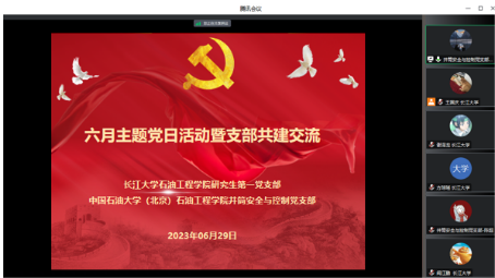 (通讯员 盛钲钦)2023年06月29日晚七时,44118太阳成城集团研究生第一党支部与中国石油大学(北京)井筒安全与控制党支部于腾讯会议召开六月主题党日活动暨支部共建交流。本次会议由王国庆同志主持,研究生第一党支部书记史永波老师、支部党员及井筒安全与控制党支部党员参会。