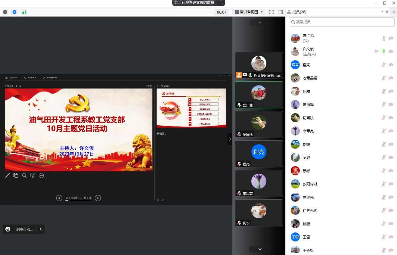(通讯员 盛广龙)为学习贯彻党的二十大精神,10月27日晚8时,油气田开发工程系教工党支部通过线上腾讯会议方式召开了10月支部主题党日活动,由支部书记许文俊主持,全体党员同志参加。