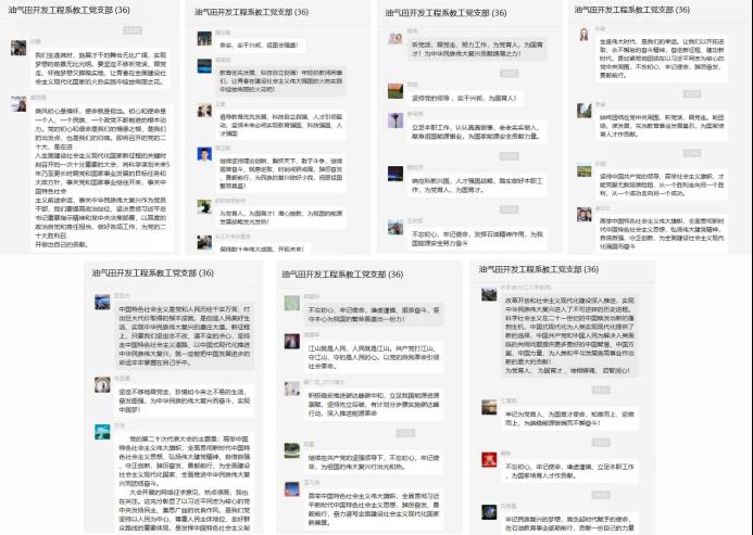 支部书记许文俊同志进行了总结:“查看各位党员同志的学习照片发现大多数同志在周末仍坚守在办公桌前开展教学和科研的相关工作,无论在家还是在办公室的党员同志们都准时收看了习近平总书记的报告,展示出了我们支部党员同志们刻苦努力、求真务实的优良作风,我相信我们只是全国493.6万个基层党组织的一个缩影。在中国共产党的正确领导下,和这样一群真抓实干的党员同志们的共同努力下,我国全面建设社会主义现代化国家、实现中华民族伟大复兴指日可待。”