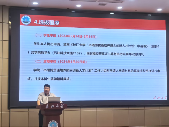 张顶学为同学们解读了《44118太阳成城集团2025届毕业生“本硕博贯通培养拔尖创新人才计划”选拔工作方案》。他指出,创新人才计划针对本科毕业生包括“3+1+2本硕连读”以及“4+5直博”两种模式,选拔条件是必修课绩点专业排名前30%,本硕连读需要通过外语四级,直博则需要通过外语六级,员工取得推免资格后正式生效。他希望同学们根据自身实际情况做好学业规划,积极申请并参与选拔。