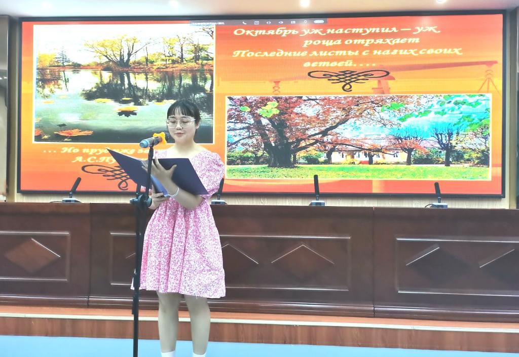 Елена Сергеевна老师(俄籍教师)表示正值这个美好的晚上,我们将集聚一堂,品味俄语诗歌并感受其深厚的民族底蕴和震慑人心的魅力。