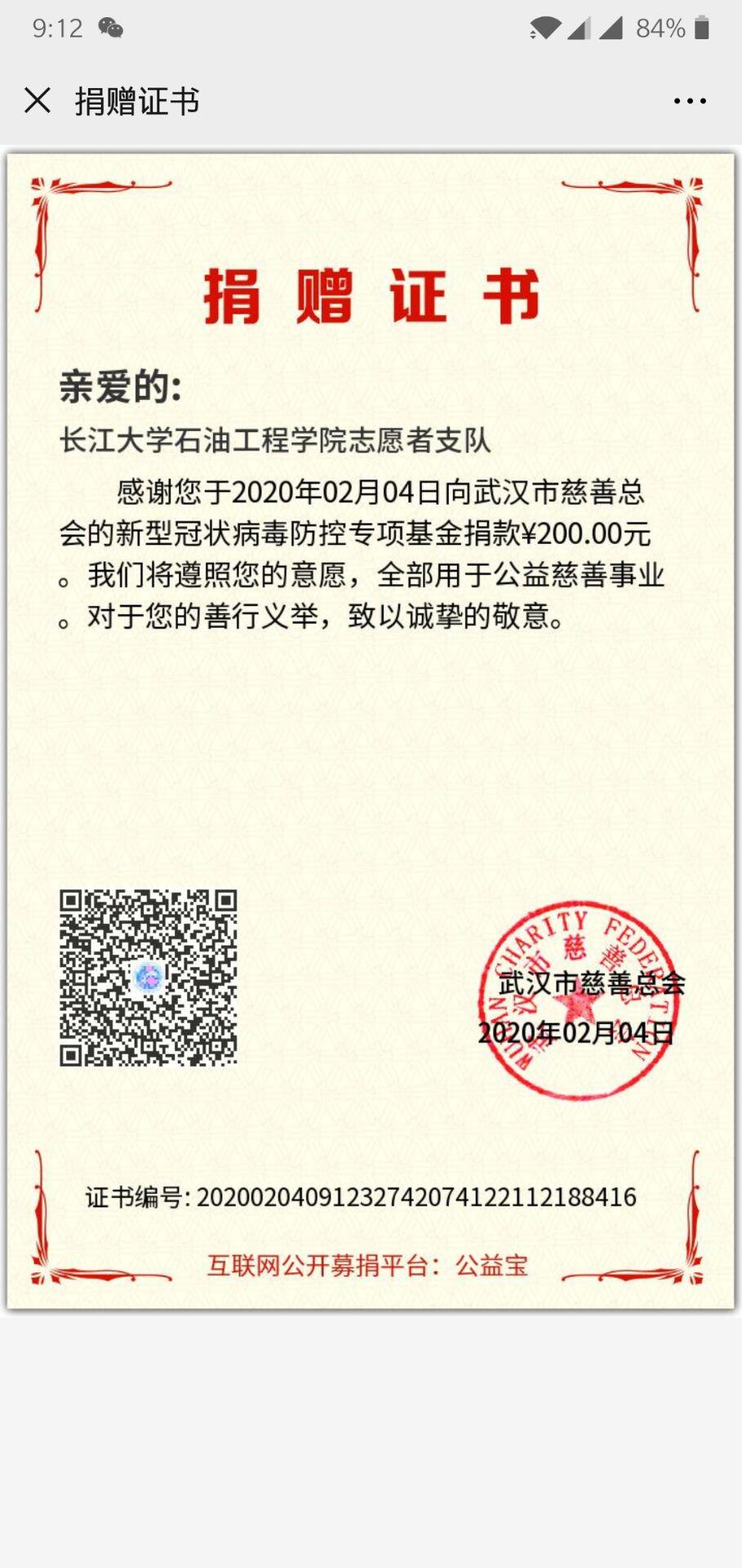 经过支队队长与大家协商之后,于2020年2月4日将共计200元资金通过微信公众号的方式捐赠给了武汉慈善总会。