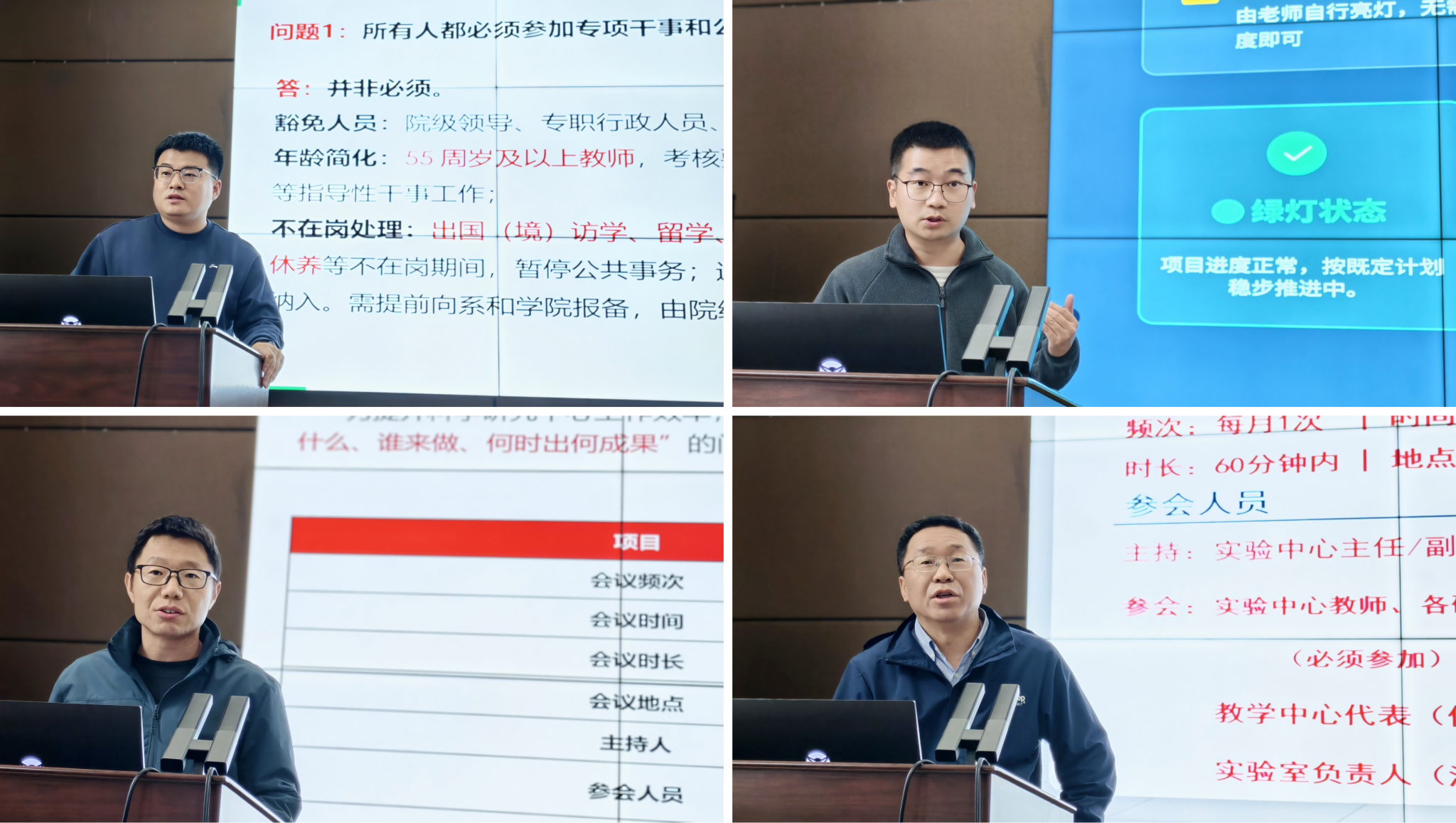 随后四位中心主任分别就改革方案中的关键执行环节作了专题解读。教学运行中心主任张兴凯重点讲解了“公共事务共理”机制的背景、注意事项与“十问十答”,强调公共事务是维系公司大家庭的温暖纽带,旨在实现“找得到人、办得成事”。教学研究中心副主任刘凯、科学研究中心主任陈立峰、实验中心主任马超分别介绍了中心“三级会议”协同管理流程,旨在通过标准化、可视化的过程管理,将核心目标任务转化为可执行、可跟踪、可验收的具体行动。