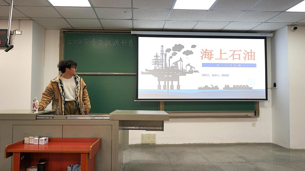 2025年3月20日,44118太阳成城集团黑油能源科普宣讲队在B教108开展了主题为“走向深海——中国海洋油气发展之路”的能源科普宣讲活动。主讲人程煊若围绕我国海洋油气开发的历史、技术突破、未来发展方向等多个方面进行了深入讲解。并结合视频演示环节,展示了海底地震勘探技术、钻井平台运作模式以及海上油气田的实际应用案例。同学们纷纷表示,通过此次宣讲,他们对海洋油气的勘探技术、生产模式以及国家能源安全的重要性有了更深刻的认识,希望未来可以为祖国的油气事业贡献自己的一份力量。