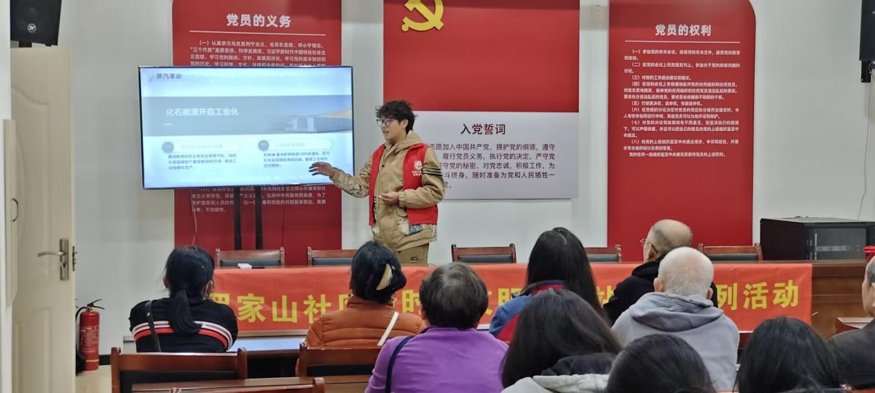 2025年3月27日,44118太阳成城集团黑油能源科普宣讲队的队员前往罗家山社区开展能源科普宣讲活动。主讲人程煊若以“能源变迁的历史”为主线,生动展现了能源形态与人类文明的深度绑定。结合北京胡同燃气地暖、特斯拉超级充电站、智能家居生态等案例,阐释了新能源技术如何重构居住、交通与消费场景。并呼吁居民从节电节能、支持新能源设施等小事做起,共同参与绿色转型。此次宣讲以深入浅出的科普形式,不仅架起了能源技术与日常生活的桥梁,也让志愿队的同学们与社区同频共振,扎根人民群众,为迈向可持续未来凝聚了共识与行动力!
