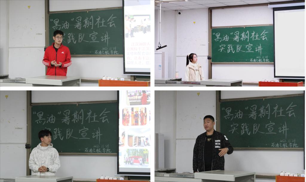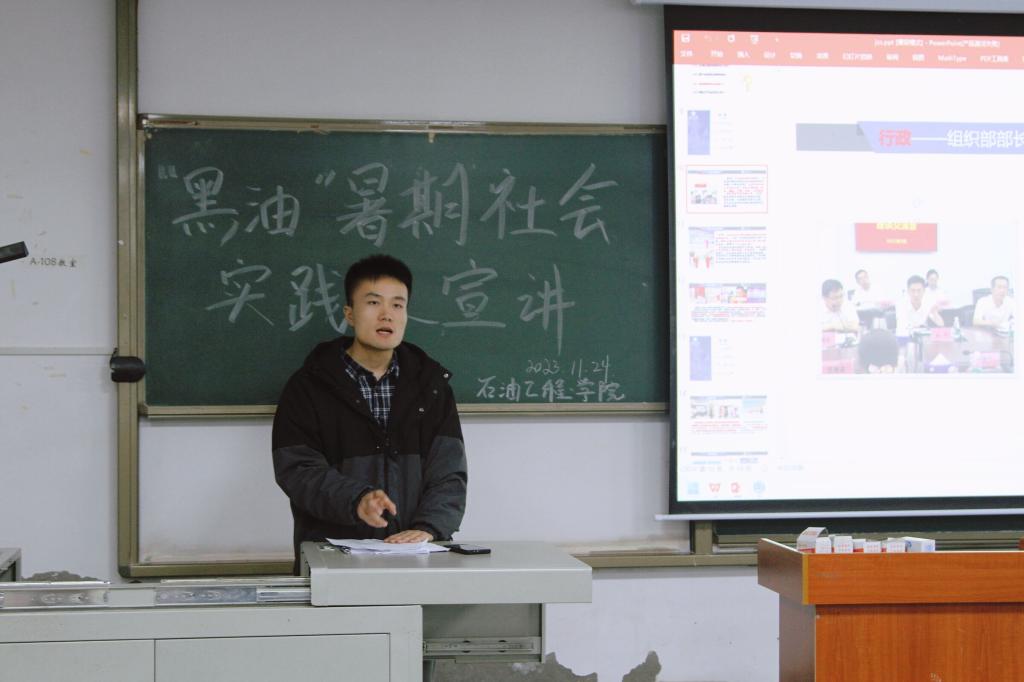 在宣讲会上,“黑油”实践队的成员们向新生们介绍了自己在此次实践活动中的实践经历和感悟。实践队队员贾正哲和李肇兴结合实例,生动地讲述了在实践中了解到关于未来工作所需要的知识、技能和素质,以及行业的发展趋势和未来前景;实践队队员高颖和冯中乙庚还分享了自己在实践中所遇到的挑战和困难,以及如何克服这些困难的经历。在宣讲过程中,石油实践队的成员们还与新生们进行了互动交流,回答了他们在学习和职业规划方面的问题。他们鼓励新生们要勇于尝试新事物,积极探索自己的兴趣和优势,并根据自己的实际情况制定合理的职业规划。