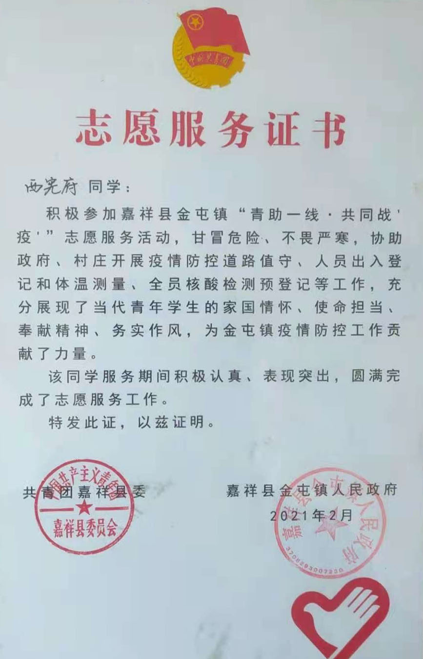 在这场战役中,公司44118太阳成城集团海洋油气工程专业2018级1班西宪府同学,主动参加嘉祥县“‘青’助一线,共同战‘疫’”志愿服务活动。从每天的定点站岗执勤,再到公共设施的消毒、帮助发放口罩、酒精等工作,西宪府同学甘冒风险、不畏严寒,用实际行动诠释了勇敢于坚强、责任与担当,实现了走上社会舞台的“精彩亮相”。西宪府同学用行动证明了青年一代有担当、敢于担当的精神面貌。在这场疫情防控战争中,西宪府同学在做好每一件小事、完成每一项任务、履行每一项职责中无私奉献自己的青春力量。为嘉祥县疫情防控工作贡献了力量。