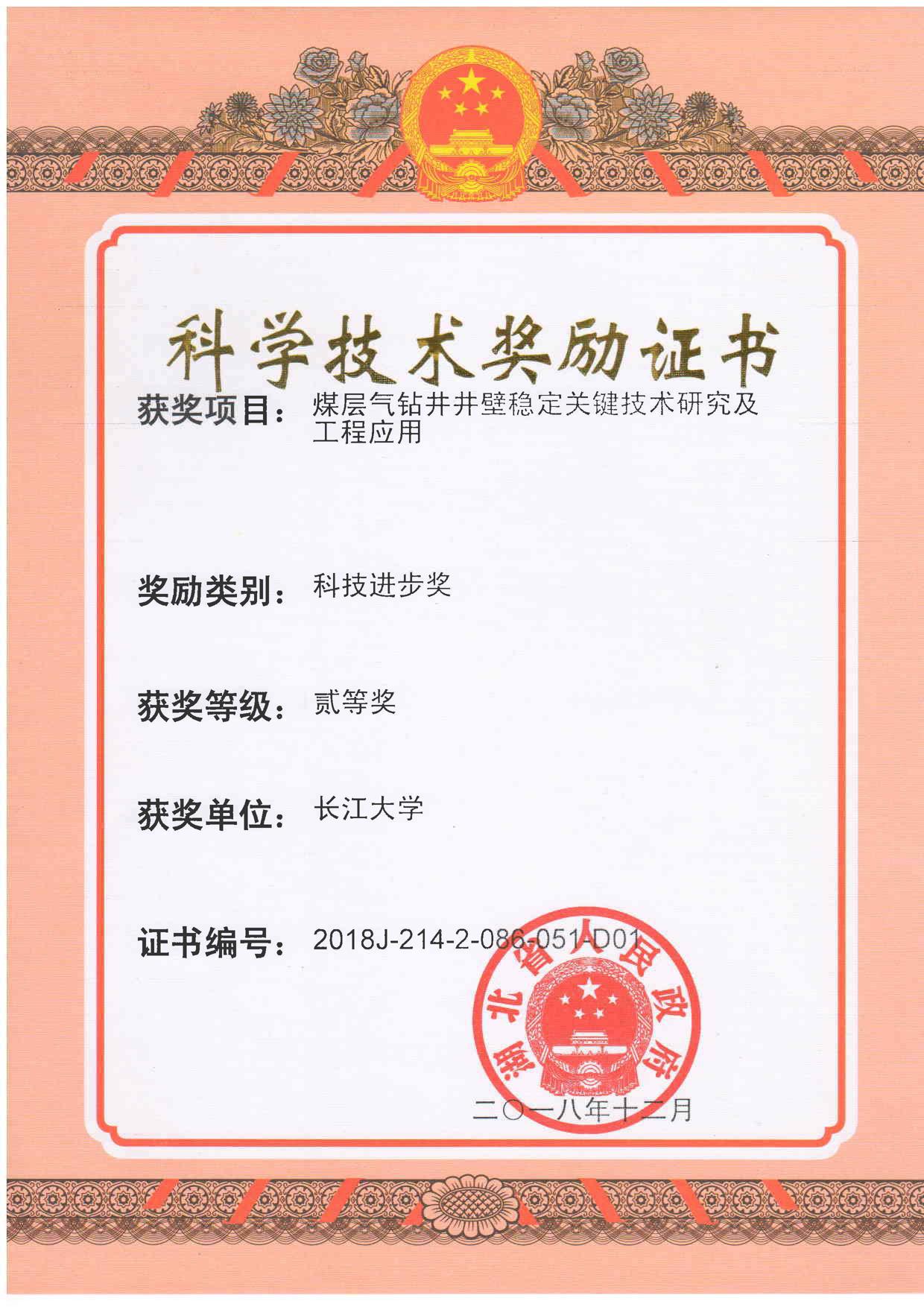 1)湖北省科技进步二等奖“煤层气钻井井壁稳定关键技术研究及工程应用”