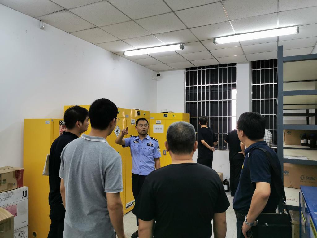 为进一步规范和加强实验室危化品安全管理工作,顺利迎接军运会的到来,2019年9月12日下午,由武汉校区后勤保障部邓平主任、路勇科长带领武汉市公安局和蔡甸区公安局相关工作人员、公司实验中心主任马超老师、欧阳传湘老师、柳建新老师等以及各公司相关负责人参加对武汉校区危化品储存间A203进行了检查。